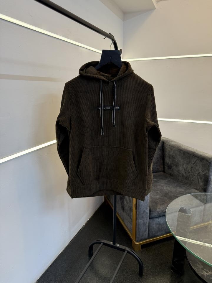 ? *Balmain imported washing cloudy look textured knitted fabric soft feel hoodie with balmain imported pu metal badge on chest front now in stock*?